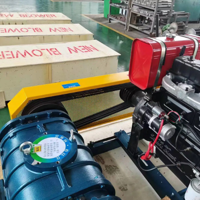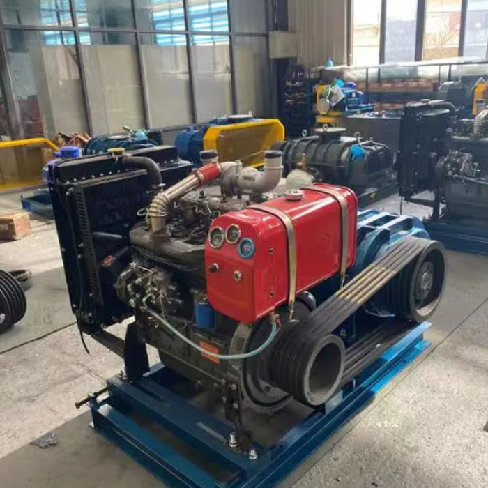 YinchiDizelsko visokotlačno puhalo Roots poganja dizelski motor. Motor poganja menjalnik, ki prenaša rotacijsko silo na rotorje puhala. Tekalna kolesa se vrtijo pri visokih hitrostih, vlečejo zrak in ga izpuščajo pri višjem tlaku. Način vožnje zagotavlja učinkovito delovanje in zagotavlja dosleden pretok zraka za izpolnjevanje posebnih zahtev različnih aplikacij. Dizelski motor ponuja zanesljivo in stroškovno učinkovito rešitev za napajanje puhala, zlasti na območjih, kjer je dostop do električne energije omejen.
